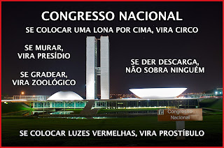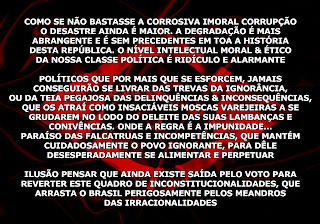 República de Mentira de Políticos Inúteis gerados por uma Matriz Defeituosa, que por mais que se esforcem jamais se libertarão das trevas da ignorância, ou da teia pegajosa das delinquências & inconsequências, que os atraí como insaciáveis moscas varejeiras a se grudarem no lodo do deleite das suas lambanças e conivências. Onde a regra é a impunidade... Paraíso das falcatruas e incompetências, que mantém cuidadosamente o povo ignorante, para dele desesperadamente se alimentar e perpetuar. Ilusão pensar que ainda existe saída pelo voto para reverter este quadro de inconstitucionalidades, que arrasta este Brasil sem esperança no futuro, perigosamente pelos meandros das irracionalidades em direção aos abismos das trevas. Isso tem que ser revertido, desconstruído, para reencontrarmos nosso Destino de Grandeza interrompido por uma traição.