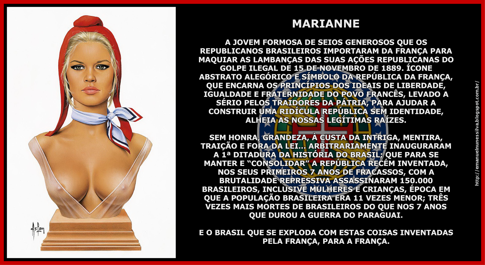 • 42 - Esta é a origem desta tua moralmente ilegítima importada à revelia República de Mentira, por meia dúzia de Traidores da Pátria, alienígena aos Valores Históricos das Raízes da Terra de Santa Cruz, e da Legítima Identidade Monárquica Imperial Nacional. Não existe Identidade Nacional Republicana Brasileira fundamentada na Revolução Francesa e nos seus ícones alegóricos de virtudes abstratas, criados para travestir o Terror numa coisa bonita de simples assimilação, com o propósito de iludir as gerações futuras, com uma velada síntese macabra dos ideais da República Francesa, impossível de serem alcançados nesta ilegítima caricatura republicana brasileira; que principiou sem honra, grandeza, à custa da intriga, mentira, traição... Assassinando 150.000 brasileiros (incluindo militares monarquistas, anciões, ex-escravos, mulheres e crianças) que se opuseram ao novo regime imposto arbitrariamente e fora da lei, fazendo com que a 1ª Republica, se perdesse num trágico vazio de retrocessos.