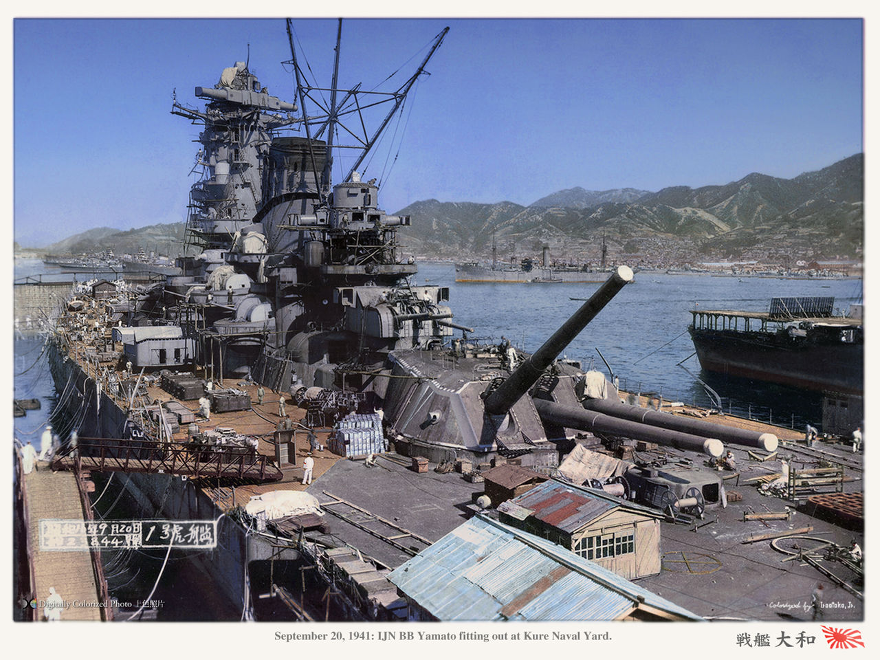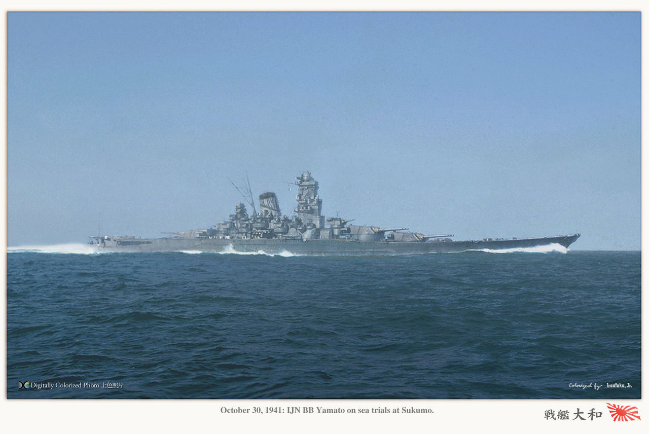(...) O Encouraçado Yamato, da Marinha Imperial do Japão foi lançado ao mar em 8 de agosto de 1940, e comissionado em 16 de dezembro de 1941 (nove dias após Pearl Harbor), o Yamato foi ao fundo após intensa e sangrenta batalha, em 7 de abril de 1945, ao largo de Okinawa, mar territorial do Japão.